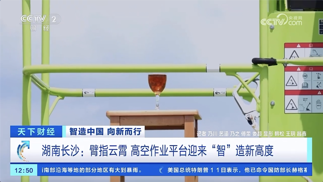 总台央视记者刘艺涵:“一台距离地面66米、正在作业的中联重科生产的臂式高空作业平台,其最大作业高度可以达到82.3米,最大作业幅度可以达到35.9米,运动精度可以达到毫米级。”