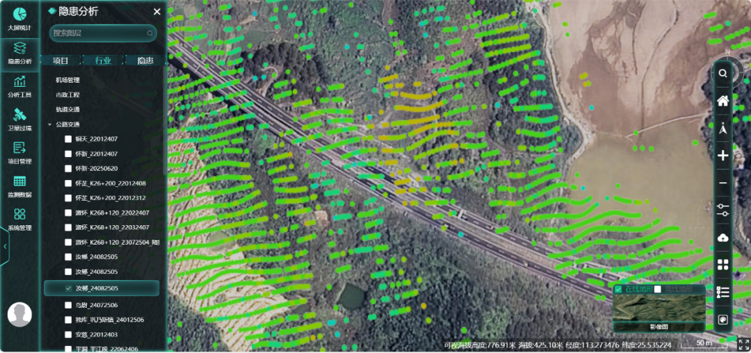 湖南交通设计院的答案是——“向天借眼”。该院联合国内科技企业,自主研发了InSAR形变早期识别云平台,以我国“陆地探测一号”卫星数据为核心,依托合成孔径雷达干涉测量(InSAR)技术,穿透植被与云雾遮蔽,精准捕捉地表毫米级的沉降、裂缝与缓慢滑移。