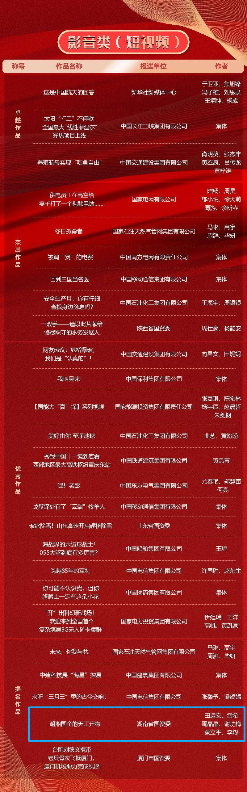 第十一届“国企好新闻”评选活动由国务院国资委宣传局、中国记协国内部指导,国务院国资委新闻中心主办,《国资报告》杂志社承办。本届“国企好新闻”共征集作品8138件,经初审、复审、终审、公示,共有文字、融媒体、影音、国际传播、人工智能(AI辅助作品)5类255件作品上榜。其中,由湖南省国资委报送、央广交通传媒(湖南)国资潇湘团队原创打造的《湖湘国企的天工开物》获影音类(短视频)提名奖,系省内唯一获奖作品。
